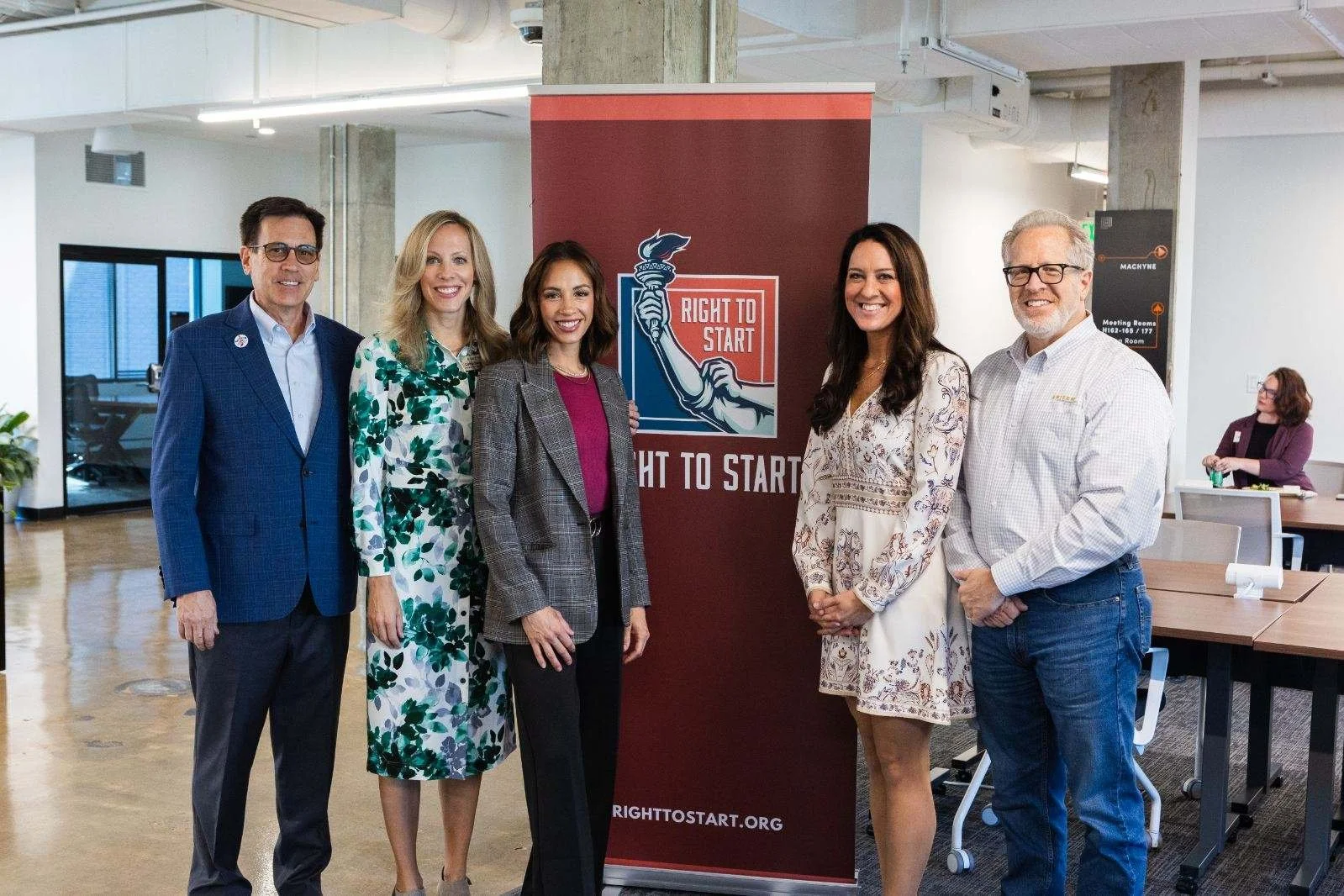 Pictured from left to right: Right to Start Ambassador Kevin Kellems, Director of Field and Campaign Strategy Catherine Read, Indiana Staters Coalition Guest Speaker and Entrepreneur Kelsey Murphy, National Coalition Manager and Indiana Starters Coalition Manager Courtney Zaugg, and Ambassador Neil Kane. Credit: Aubry Miller.
